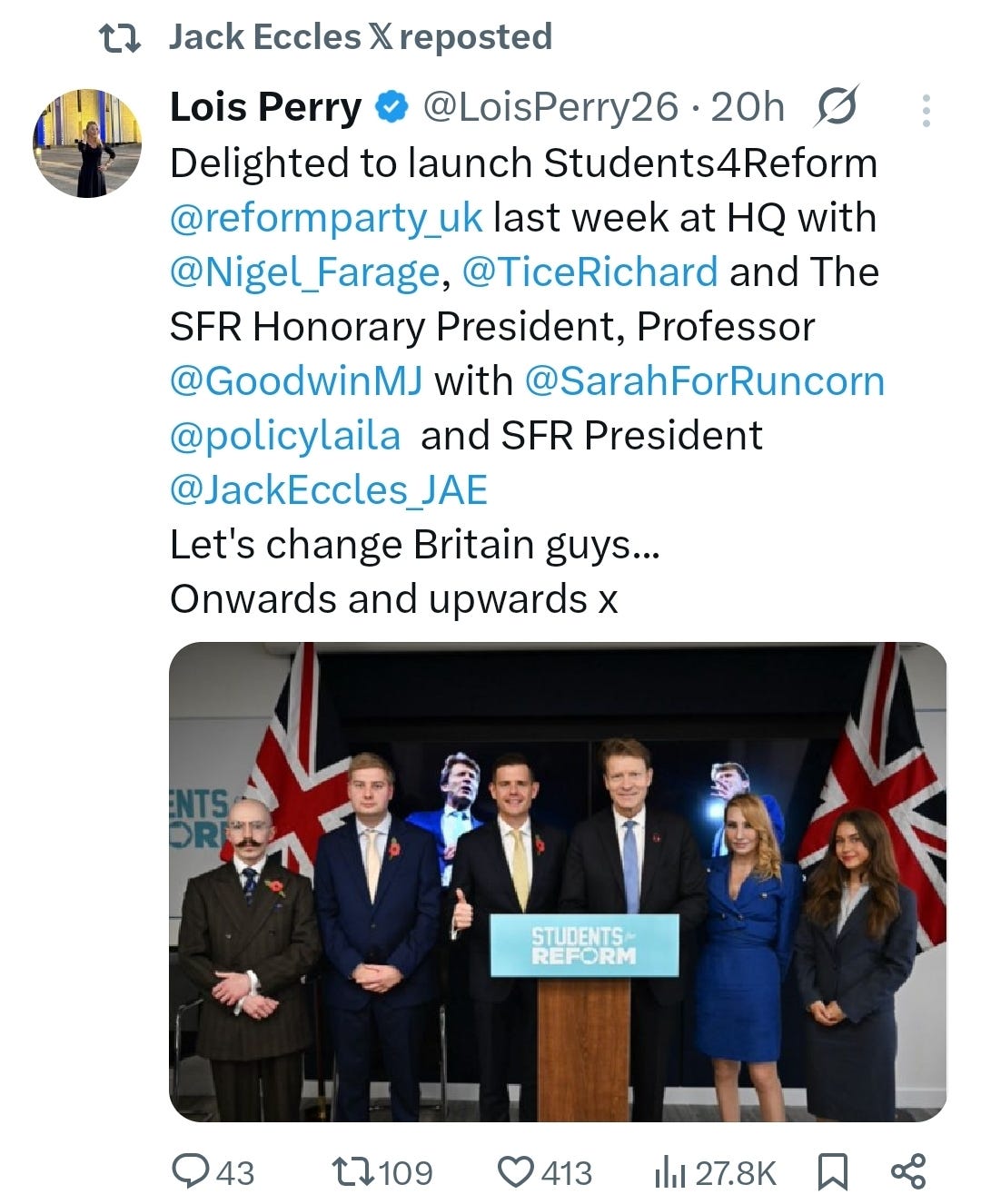 Meanwhile, Perry is also leading a new campus initiative called “Students for Reform,” as mentioned before, described by observers as an ideological student-outreach project echoing earlier youth-mobilisation efforts linked to Farage’s associates, including those active at Durham University and Turning Point UK. The creation of a new group focused on students could indicate the beginning of some distancing between Turning Point UK and Farage.
